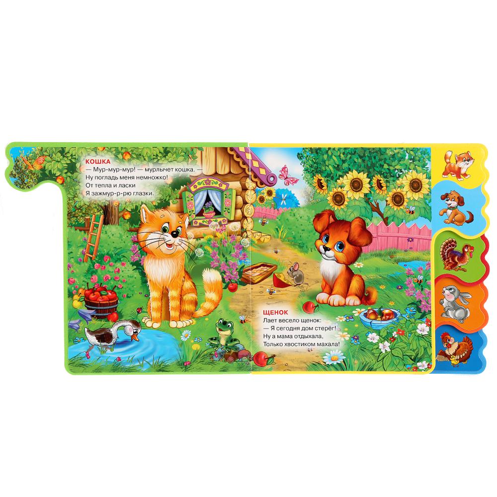 Оригинально оформленная книжка с фигурной вырубкой страниц и красочным изображением домашних животных обязательно привлечёт внимание ребёнка. Ребёнок будет с удовольствием рассматривать яркие иллюстрации и слушать добрые стихи про животных. Благодаря компактному формату енижку удобно взять с собой.