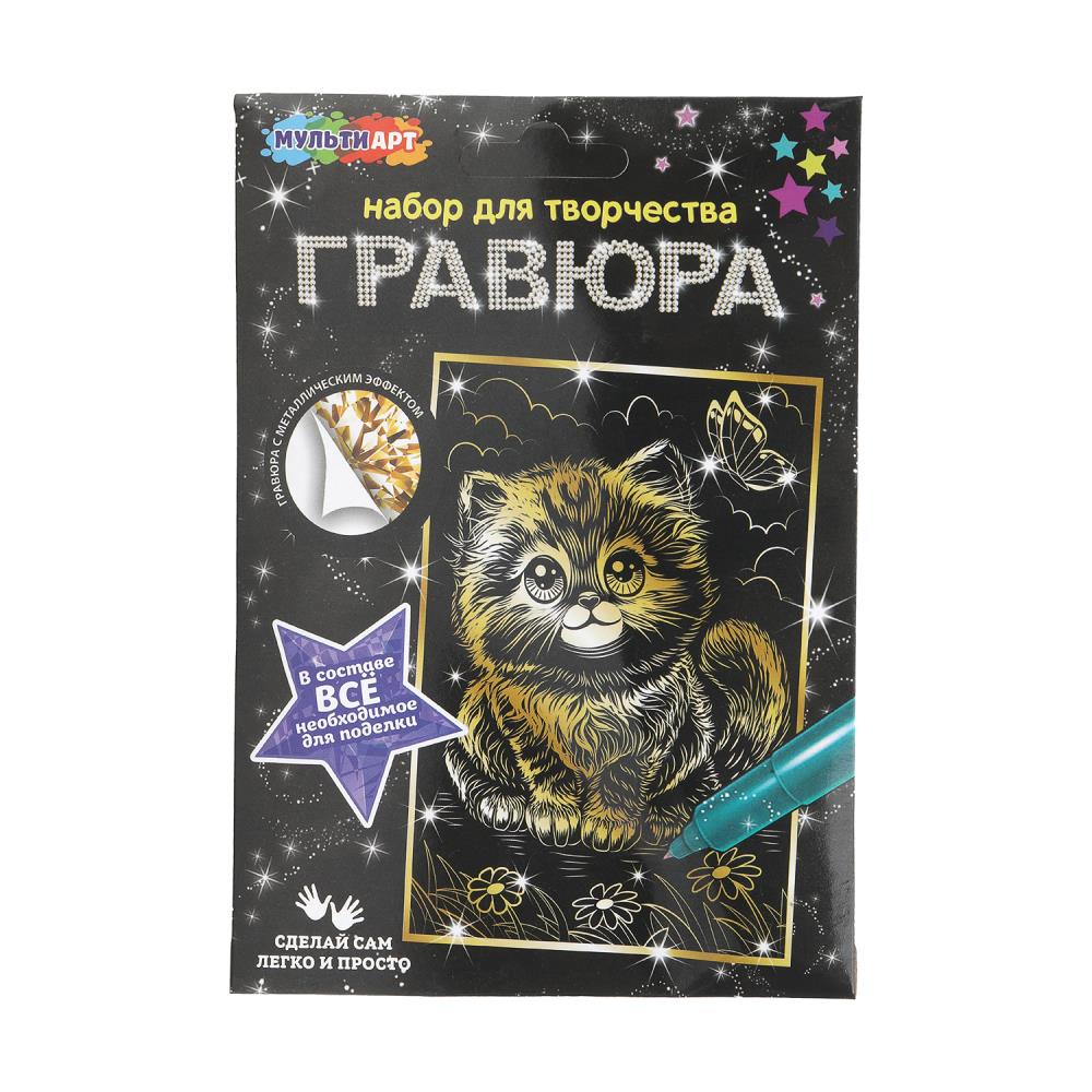 С помощью данного набора юный художник сможет создать эффектную золотистую картину на чёрном фоне. Контур рисунка уже нанесён на основу, остаётся только процарапать изображение специальным штихелем. Можно не повторять каждую черточку, главное — соблюдать направление штриха! Готовая поделка станет отличным вариантом для подарка близким или для украшения интерьера комнаты.