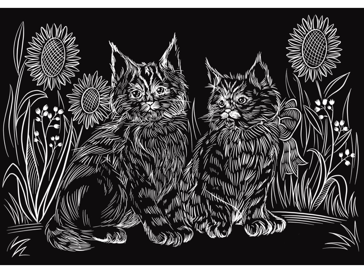 Гравюра А4 в пакете с ручкой. Золото. Котята в подсолнухах