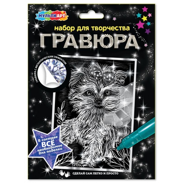 С помощью данного набора юный художник сможет создать эффектную серебристую картину на чёрном фоне. Контур рисунка уже нанесён на основу, остаётся только процарапать изображение специальным штихелем. Можно не повторять каждую черточку, главное – соблюдать направление штриха! Готовая поделка станет отличным вариантом в качестве подарка близким или украшения интерьера комнаты.