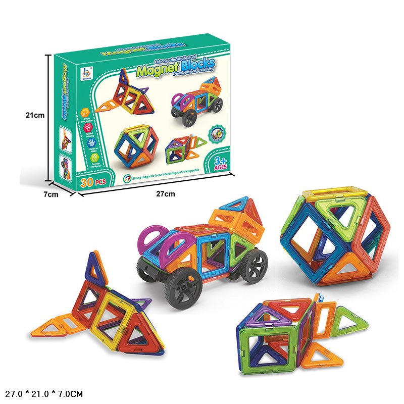 Конструктор магнитный 30дет. с колесами, геометр. форма, в кор.