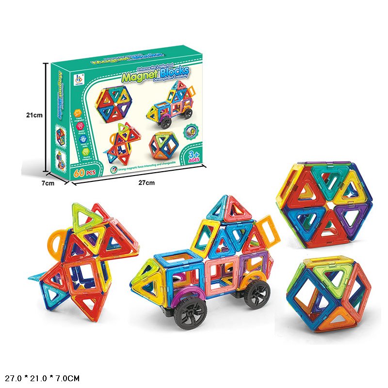 Конструктор магнитный 60дет. с колесами, геометр. форма, в кор.