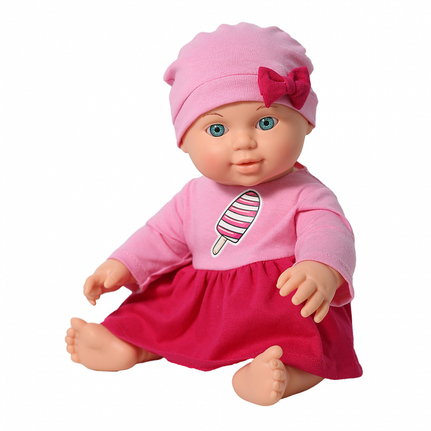 Высота 30 см. Тело куклы полностью выполнено из эластичного, приятного на ощупь винила. Пупс не имеет гендерных признаков. Глазки малышки вставные, не закрывающиеся, имеет рельефный кукольный паричок, без звукового модуля. Куклу можно купать в ванне, не боясь попадания воды внутрь игрушки.