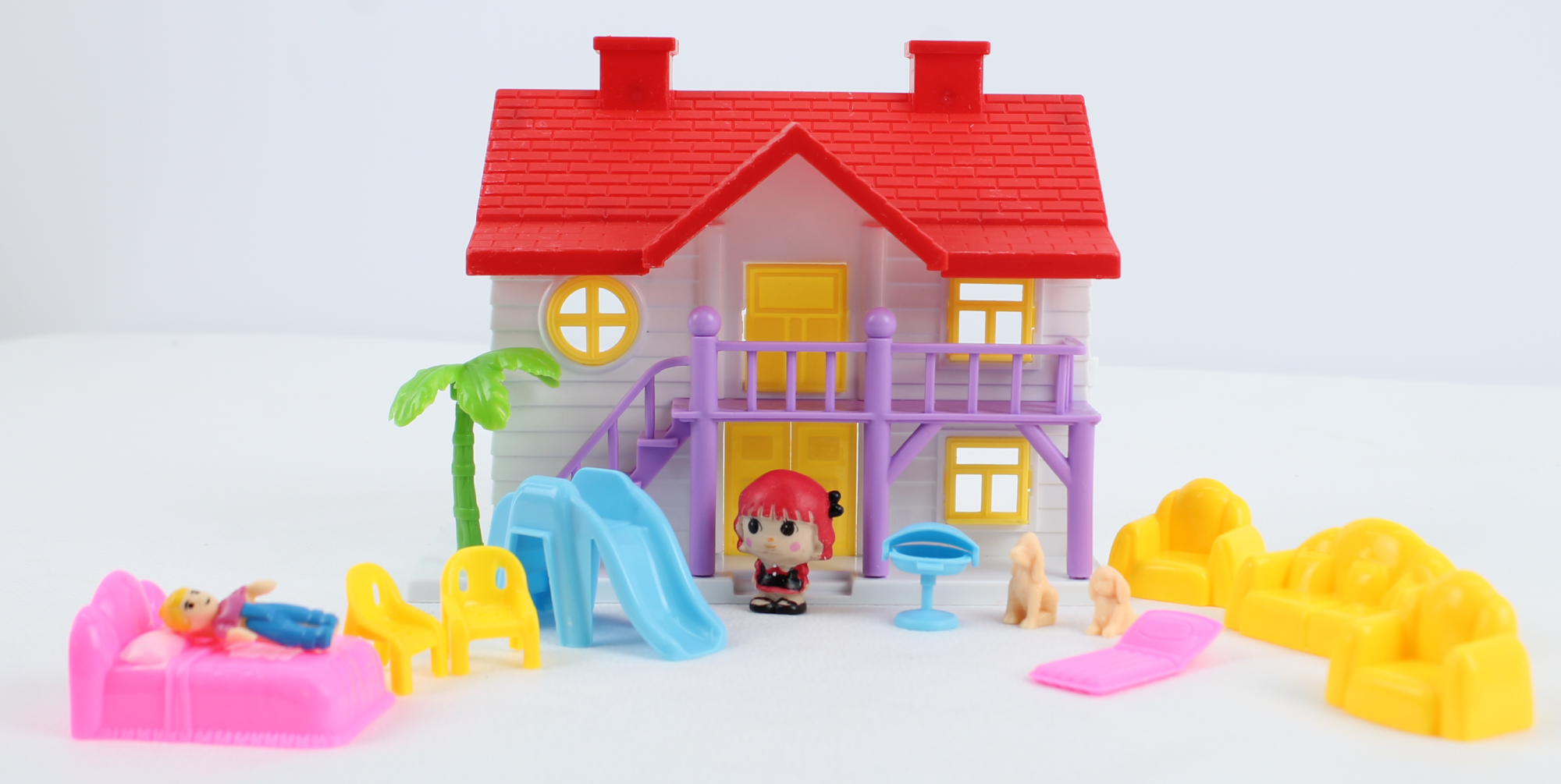 комплект: горка, диван, кресла, столик. кровать, шезлонг, собаки, пальма , стулья. куклы