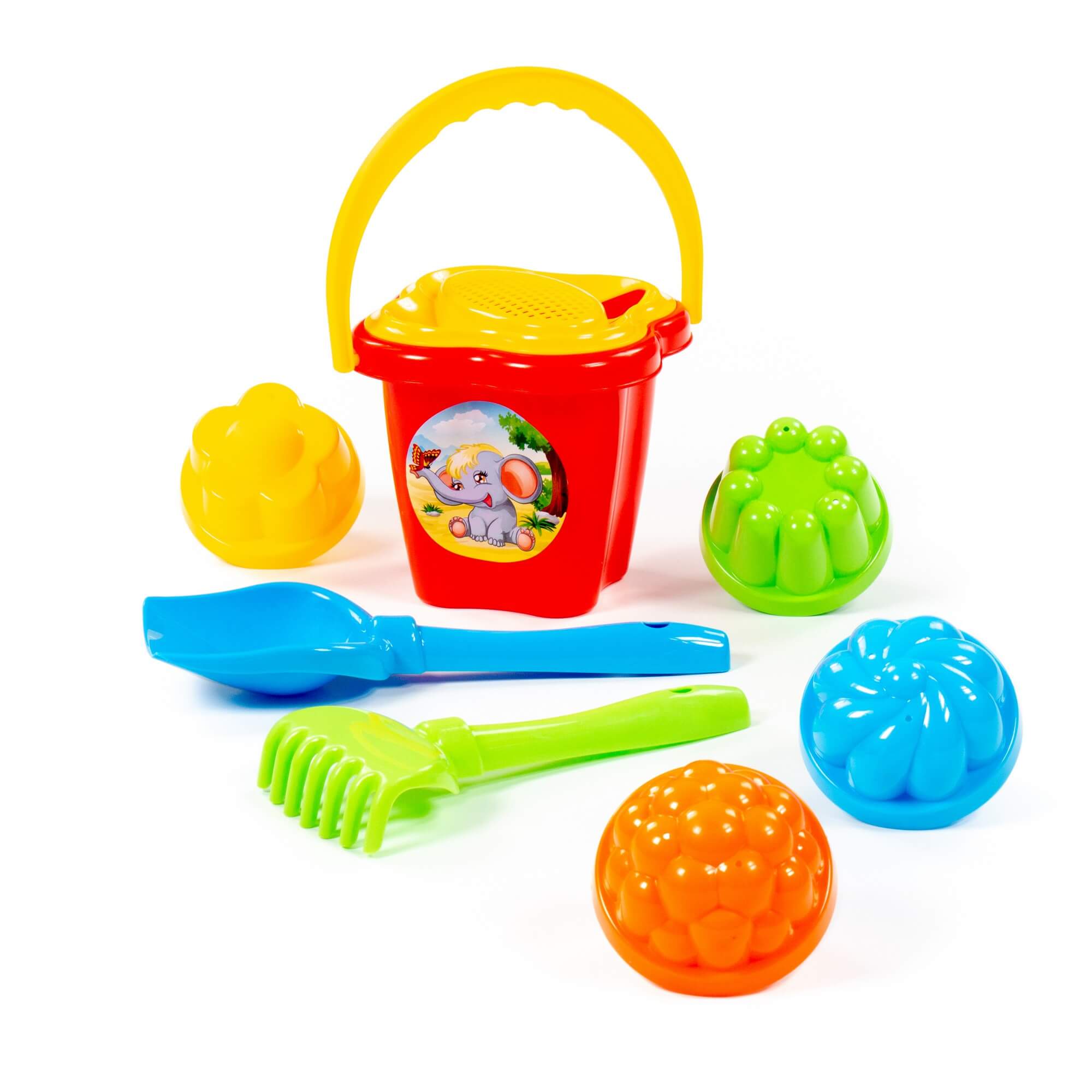 Набор №142: ведро-цветок среднее, ситечко-цветок, лопатка №5, грабельки №5, 4 формочки