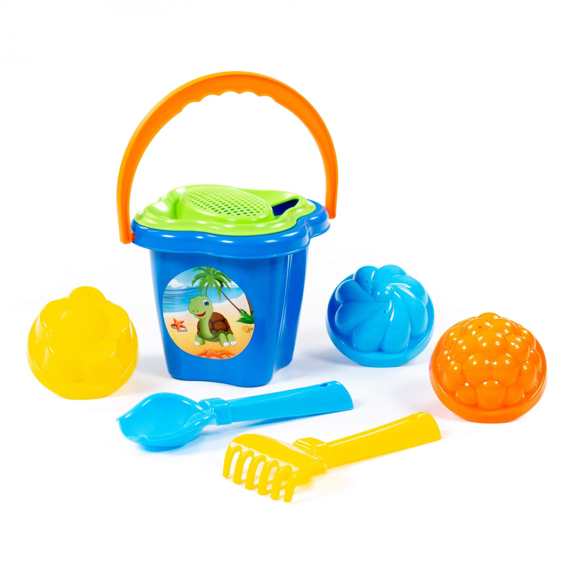 Набор №21: ведро-цветок среднее, ситечко-цветок, совок №2, грабельки №2, 3 формочки