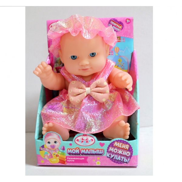 Этот милый пупс с детально проработанным личиком обязательно понравится вашему ребёнку. Куколка одета в красивое блестящее платьишко розового цвета с бантом на груди, на голове — повязка в тон. Одежда легко снимается и надевается. Очаровательный малыш непременно вдохновит девочку на множество интересных сюжетов для игр, тем более его можно купать в воде.