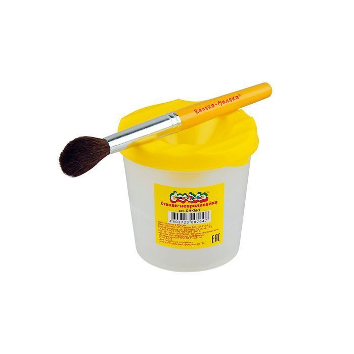 Имеет удобную, плотную крышку солнечного ярко-желтого цвета. Крышка приспособлена для удобного расположения на ней кисточек.